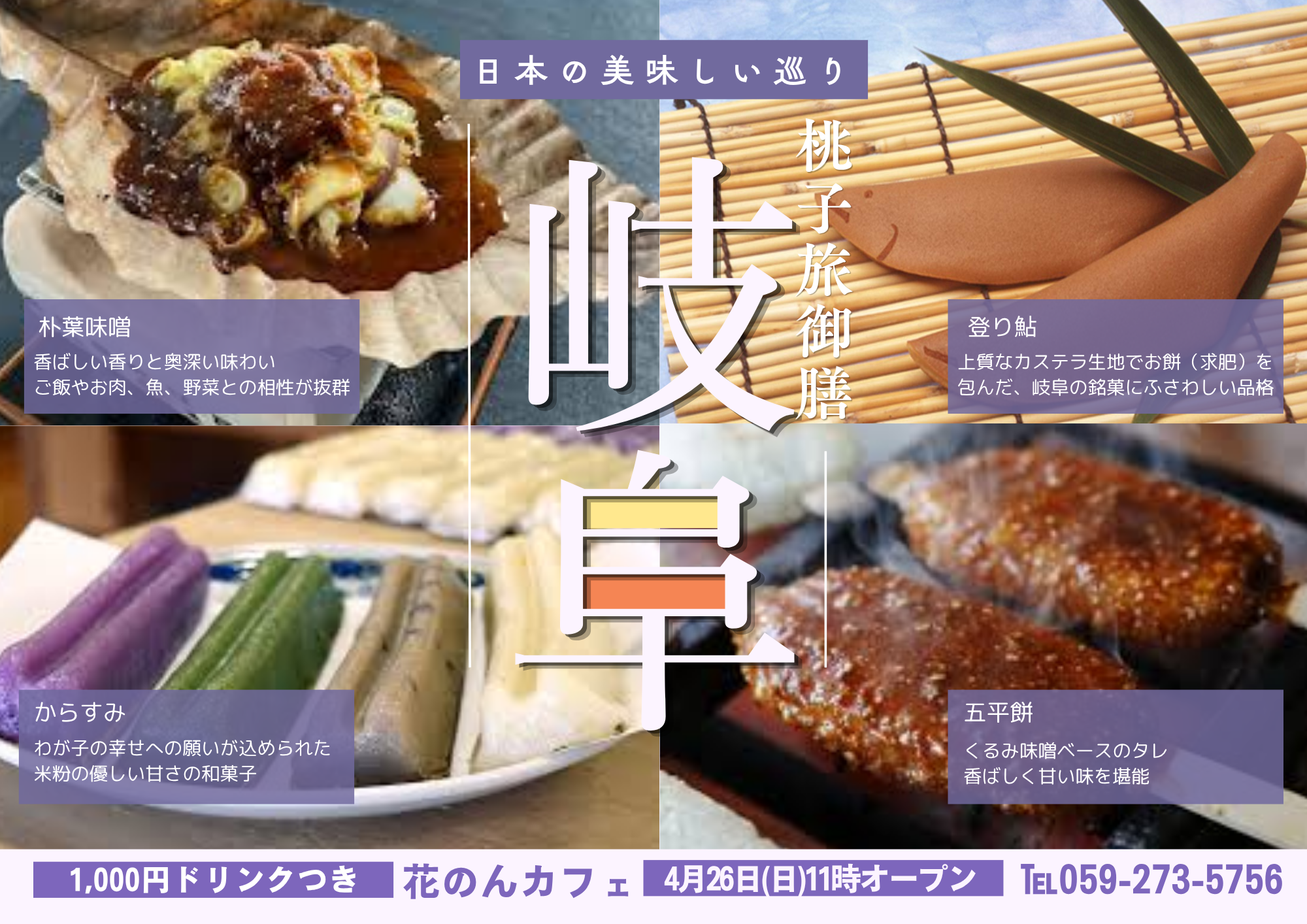 Uncategorized今月の花のんカフェは、「日本の美味しい巡り 桃子旅御膳〜岐阜〜」をテーマに開催します!